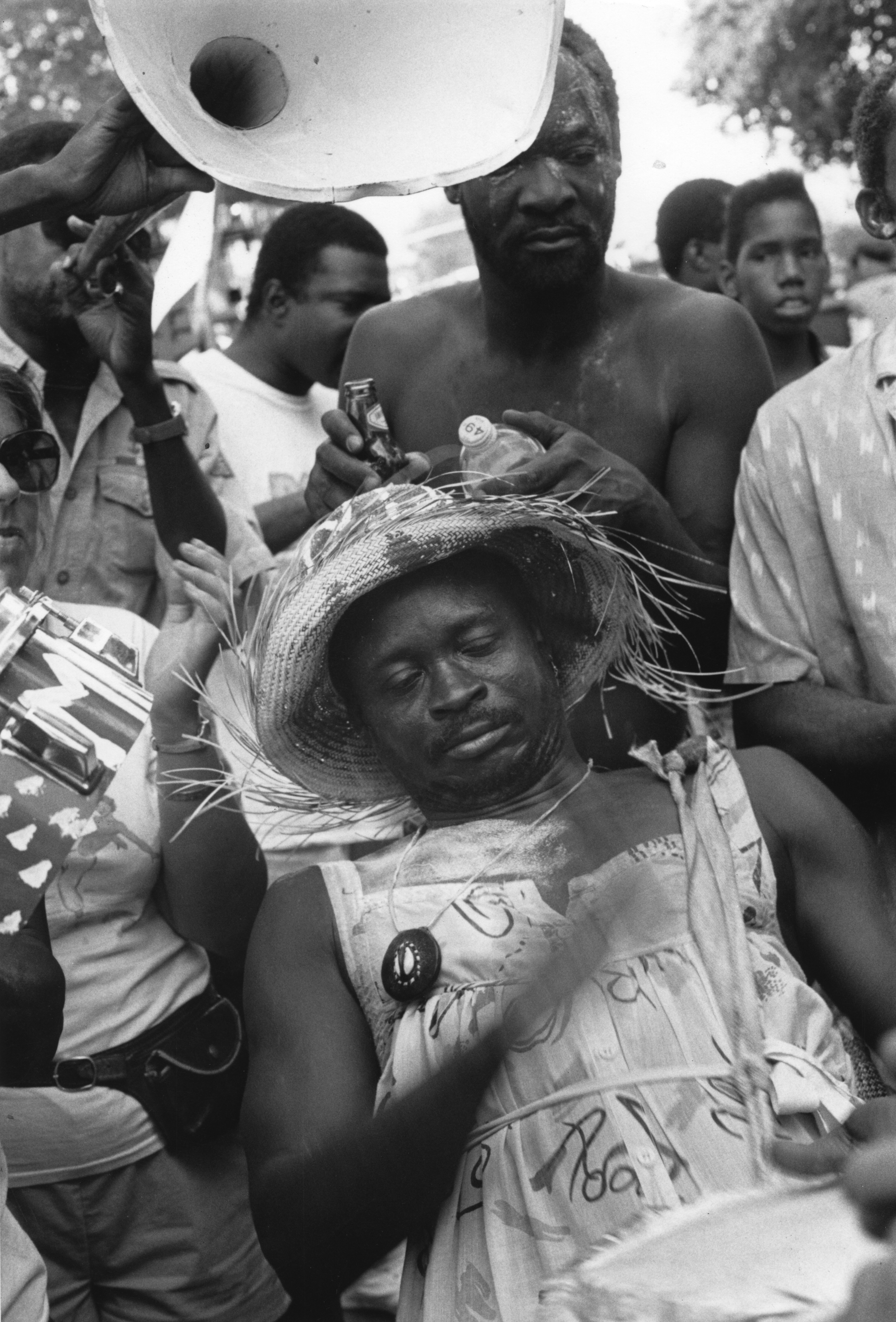 Frisner worked with a friend to paint the large wooden sign crediting our sponsor. (It was not lost on our Haitian friends that the acronym BACA, pronounced with a hard “C,” is baka in Kreyòl: a little demon.) He embellished the words in the front with the cover of his 1986 album Èzili and a cutout photo of himself with a trophy from the back of his 1982 album A Trip to Vodou. The back of the sign bore images of various Vodou spirits. The hood of the cab carried a drapo, one of Haiti’s sequin arts, this one flashing a symbol of the spirit of love. Props also included a flag sporting more symbols of the spirits on a base that resembled the Haitian national flag. We made sure that Haitians who lined the Parkway—treated mainly in 1990 to calypso and soca from Trinidad and maybe a spot of Haitian konpa–got a nice Afro-Haitian bouyon rasin (roots stew). In case you’re wondering, the maestro’s costume was a yellow cotton print dress he’d bought for me in a Miami flea market.